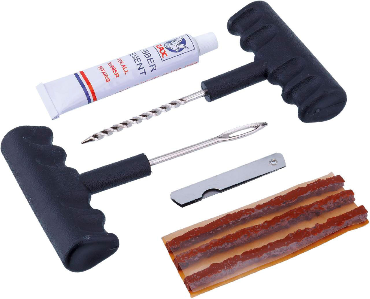 Позволяет быстро отремонтировать прокол бескамерной шины. Для ремонта необходим лишь данный набор, домкрат и насос.