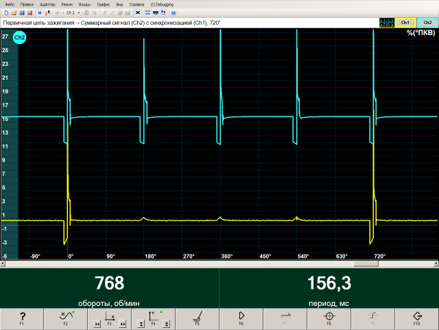 Желтый график - сигнал первичной цепи зажигания ИКЗ 1-го цилиндра.