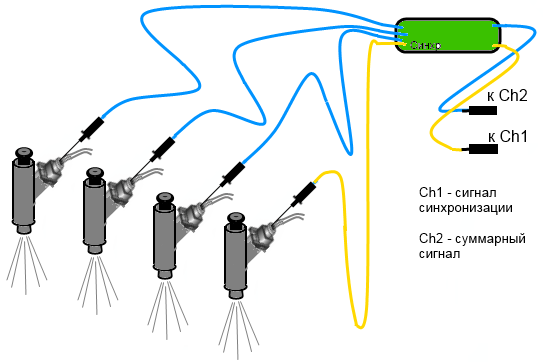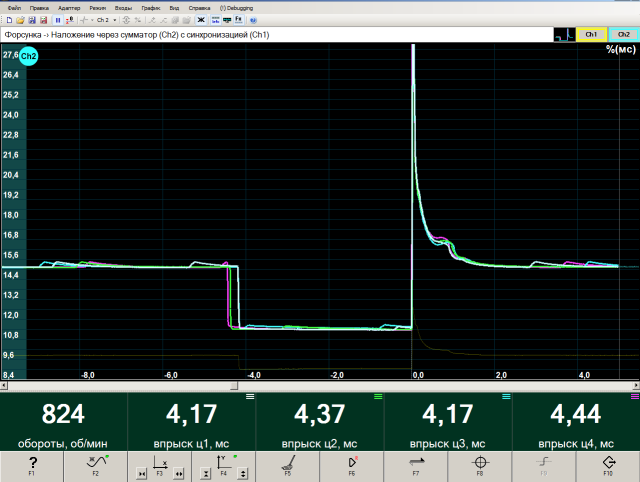 Желтый график - сигнал цепи управления форсункой 1-го цилиндра.