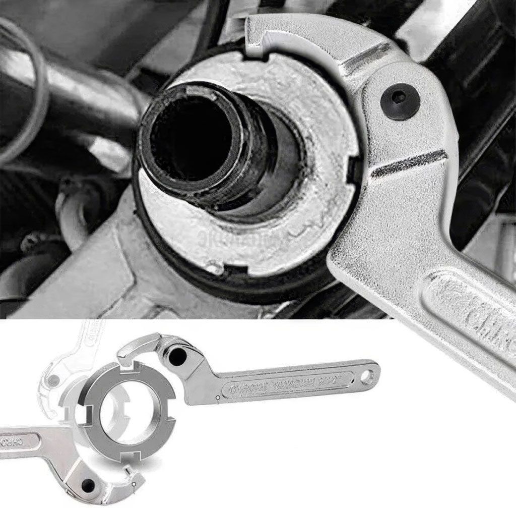 - Специальный ключ для работы с крепежом не имеющим граней. Имеет шарнир, позволяющий увеличить диапазон диаметров крепежа.