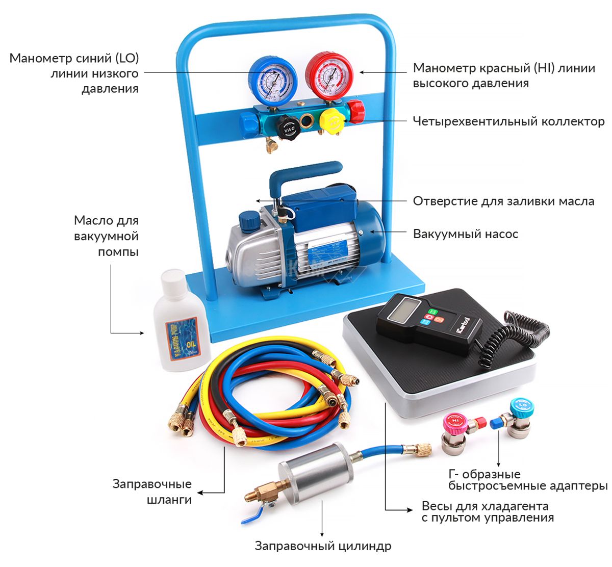 заправочный цилиндр для масла и набор Г-образных быстросъемных разъемных соединений.
