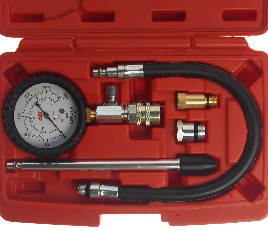 Компрессометр с набором адаптеров JTC-1621A служит для точного замера компрессии автомобильного двигателя (бензинового). Модель позволяет определять давление величиной 0-300 psi, 21 кг/см, 21 бар и 2100 кПа. Длинный гибкий шланг обеспечивает удобный доступ к объекту диагностики. Мягкая вкладка в кейс исключает случайное повреждение оборудования при транспортировке.