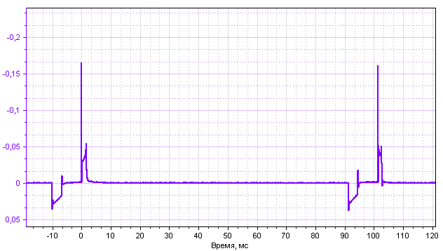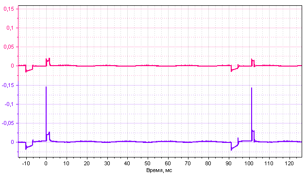 Осциллограмма импульсов вторичного напряжения двухполярной системы зажигания 4-х цилиндрового двигателя снятая с помощью комплекта ВВ емкостных датчиков DIS-4. Используется псевдодифференциальный режим аналоговых каналов 7 и 8 - на графике отображенная разность соответствующих рабочих и холостых искр.
