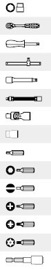 торцевые головки 1 / 4” 4, 4.5, 5, 5.5, 6‑13 мм ключ трещоточный с быстрым сбросом 1 / 4” 72 зубца* отверточная рукоятка 1 / 4” 150 мм вороток Т-образный 1 / 4” 115 мм удлинители 1 / 4” 50, 100 мм гибкий удлинитель 1 / 4" 150 мм кардан шарнирный 1 / 4” 40 мм битодержатель 1 / 4"х1 / 4" 25 мм набор бит 1 / 4”: – шестигранные HEX 1.5, 2, 2.5, 3, 4, 5, 6 мм – шлицевые Slot 3, 4, 4.5, 5, 5.5, 6, 7 мм – крестовые Philips РН0, РН1, РН2, РН3, РН4 – крестовые Pozidriv PZ0, PZ1, PZ2, PZ3, PZ4 – Torx BO ТH10, ТH15, ТH20, ТH25, ТH27, TH30 держатель для бит для механизи- рованного привода 1 / 4" 50 мм |
