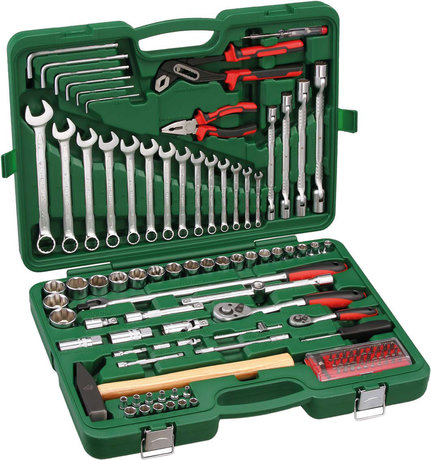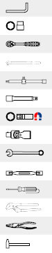 угловой ключ шестигранный 2.5, 3, 4, 5, 6, 7 мм торцевые головки 1 / 2” 8, 10, 12‑27, 30, 32 мм ключ трещоточный с быстрым сбросом 1 / 2” 72 зубца* вороток шарнирный 1 / 2" 430 мм удлинитель-вороток Т-образный 1 / 2” 250 мм удлинители Wobble 1 / 2” 50, 125 мм головки свечные 1 / 2” 16, 21 мм кардан шарнирный 1 / 2” 70 мм ключи комбинированные 6‑14, 17, 19, 22 мм ключи двухсторонние шарнирные 10х11, 12х13, 14х15, 17х19 мм индикатор напряжения автомобильный 6V-12V-24V клещи переставные 10" / 250 мм пассатижи 6" / 160 мм молоток с ручкой из дерева гикори 500 г |