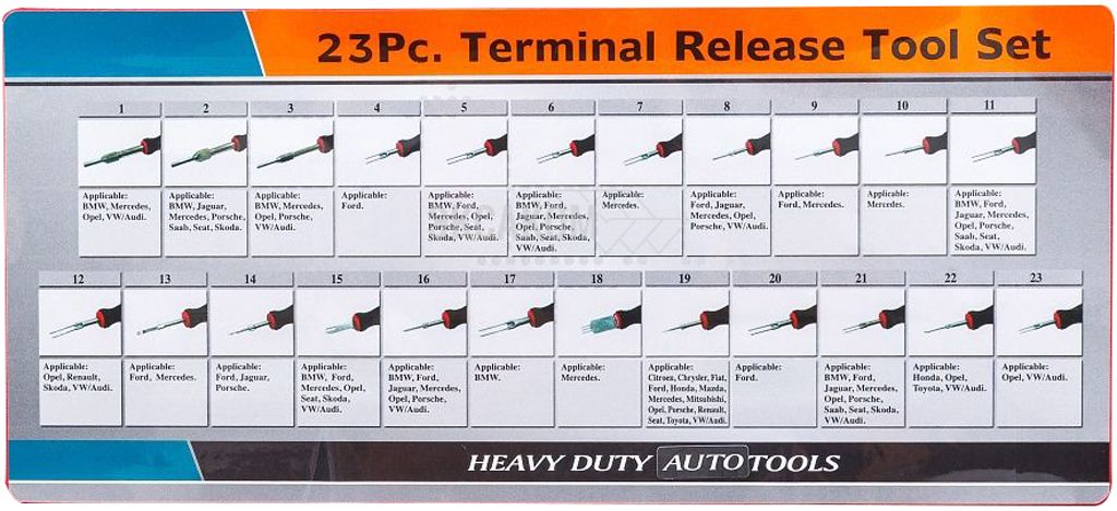 - экстракторы контактов подходят для BMW, Mercedes, Opel, VW, Audi, Porsche, Ford, Seat, Skoda, Jaguar, Citroen, Fiat, Saab, Mazda, Renault, Chrysler, Toyota, Honda, Mitsubishi и др.
