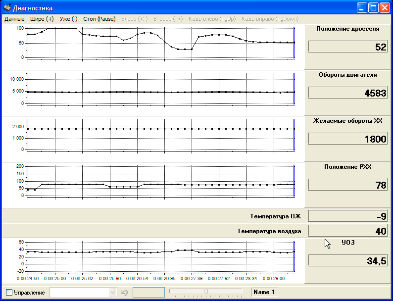 - Диагностические данные отображаются в цифровом и графическом виде, возможно сохранение их в файл для дальнейшего анализа.