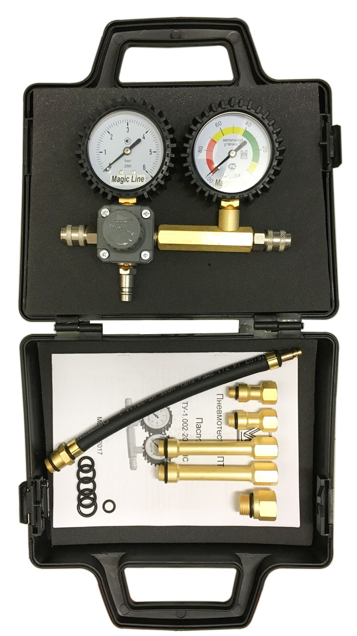 - Пневмотестер в сборе (два манометра, регулятор давления воздуха, пневмоклапан) - 1 шт.