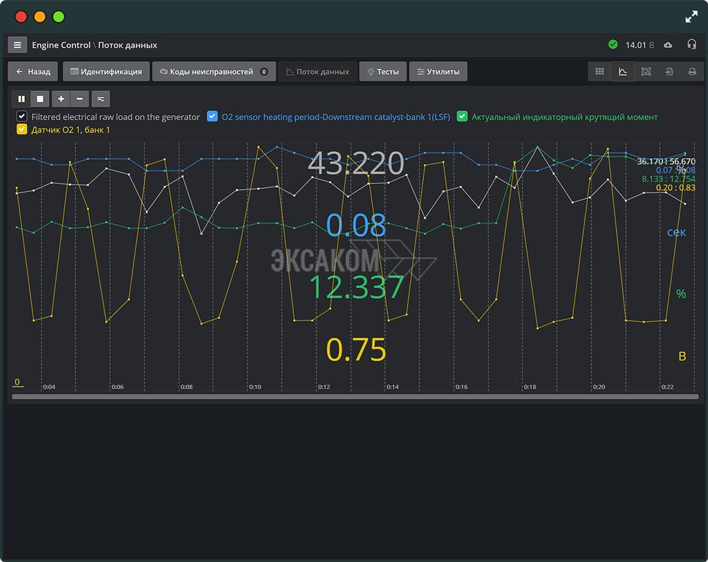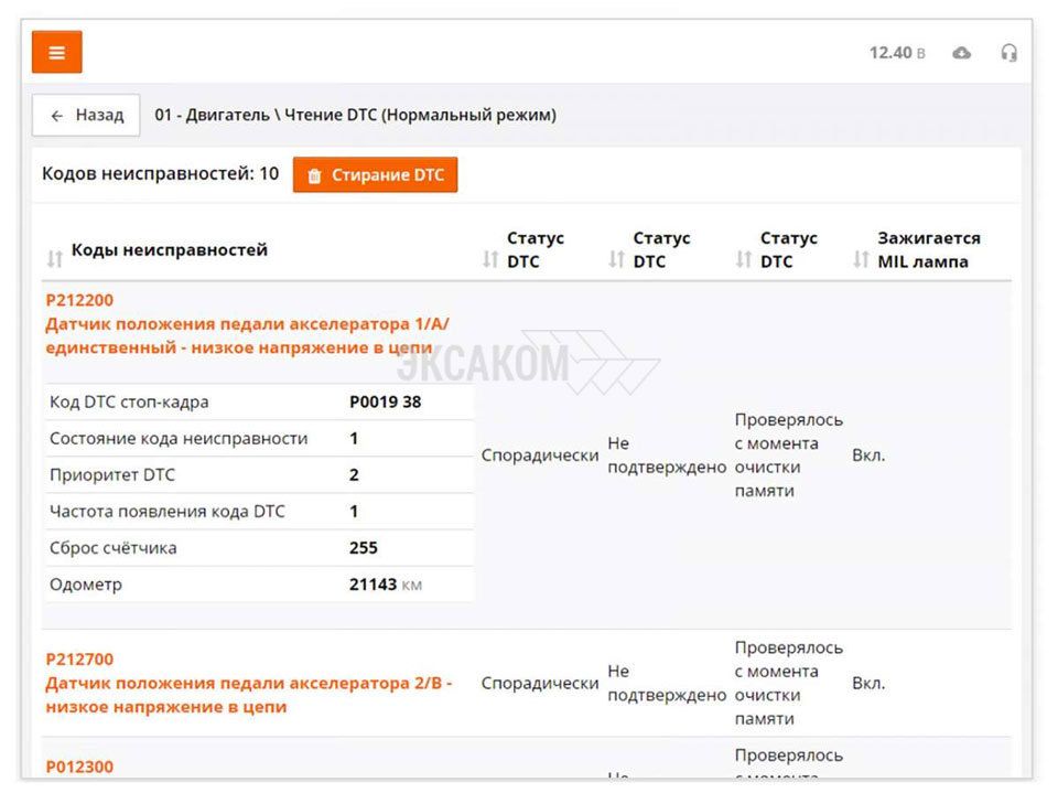 Отображение кодов, поддержка стоп-кадра Программа выдает всю информацию о содержащихся в блоке ошибках, включая данные об их статусе и информацию о состоянии прочих систем автомобиля в момент возникновения ошибки (как в режиме OBD, так и по заводскому протоколу, если эта функция поддерживается самим автомобилем) |