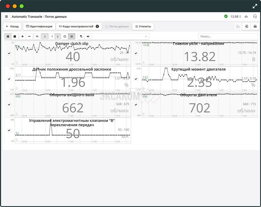 Ключевые параметры выводятся в главную инструментальную панель программы, а все остальные могут быть отображены в удобном для диагноста виде: