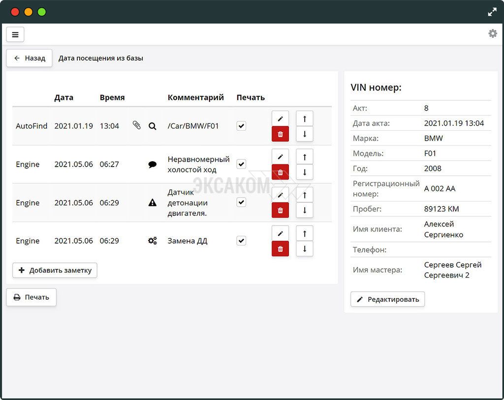 В программном обеспечении ScanDoc реализована возможность хранить и просматривать все проведенные сессии диагностики – с сохранением информации о клиенте, выявленных ошибках, текущих значениях и проведенных операциях. Диагност может оперативно просмотреть всю «историю болезни» обслуживаемого автомобиля.