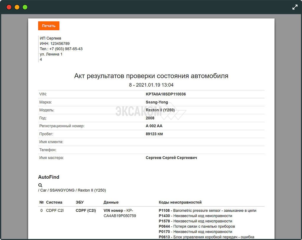 Программа может не только хранить отчеты о проведенных сеансах диагностики, но и выводить на печать всю снятую с автомобиля информацию в удобном виде, - предлагая полный отчет о произведенных работах и о текущем состоянии системы. В отчет могут быть включены ошибки, текущие значения, любые форматы дополнительных файлов (фото-, видео-), файлы данных мотортестера Мотодок , любые дополнительные комментарии диагноста или владельца а/м.
