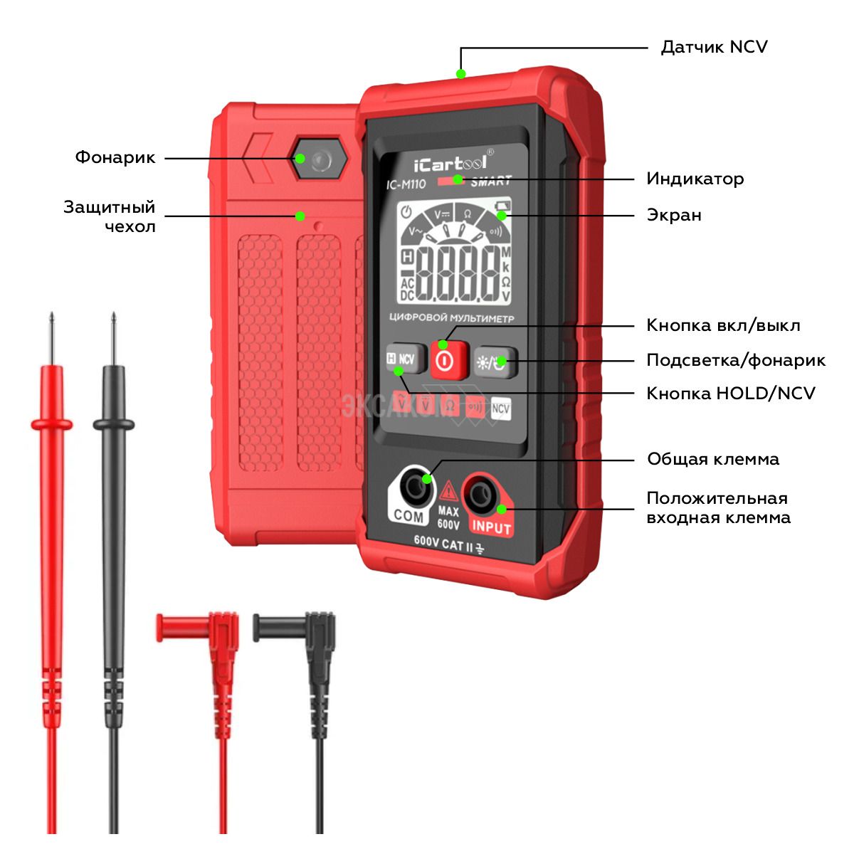 Смарт мультиметр iCartool IC-M110 с автоматическим выбором режима измерений. Имеет контрастный дисплей, компактные размеры, защитный резиновый чехол и функцию определения переменного напряжения бесконтактным методом (NCV). Яркий светодиодный фонарик обеспечивает подсветку рабочей зоны, а экран отображает полярность, измеряемый параметр и его значение. Прибор имеет звуковую и световую индикацию. Незаменим для ремонтных работ по электрике в быту и гараже, идеален для первых шагов в работе с мультиметрами.