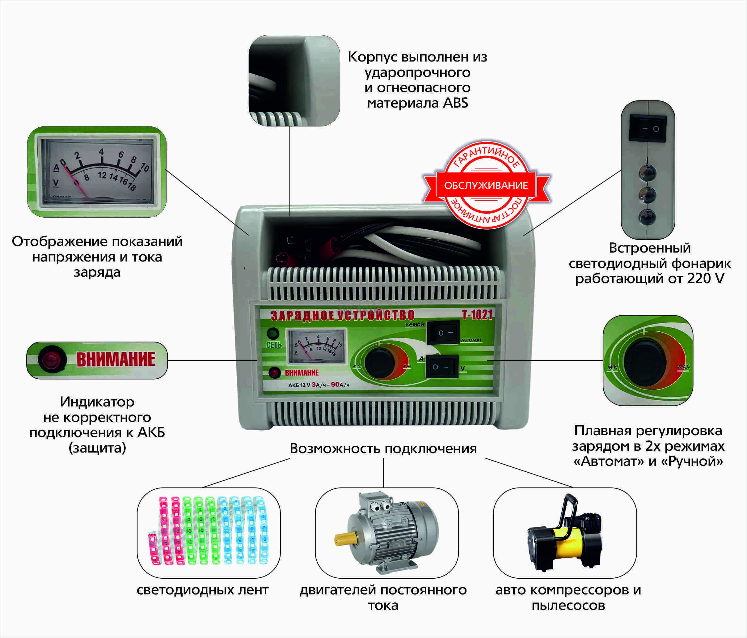 - Мощное, простое в использовании, компактное, со встроенным фонариком зарядное устройство Т-1021 предназначено для зарядки и профилактики все типов аккумуляторных батарей.