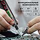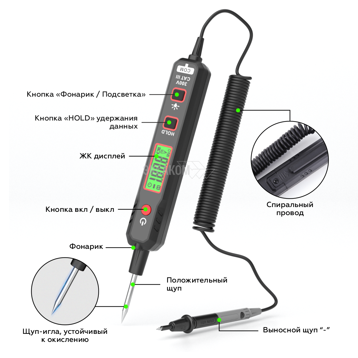 Тестер выполнен из ударопрочного ABS-пластика, имеет жк-дисплей с подсветкой, фонарик, металлический щуп и спиральный провод с выносным щупом.