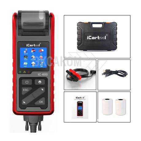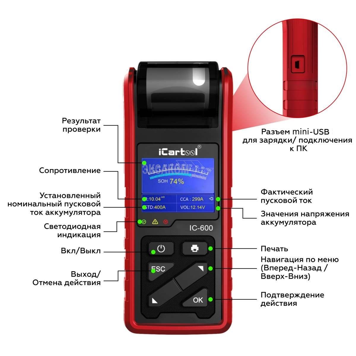 Тестер аккумуляторных батарей iCartool IC-600 предназначен для оценки состояния АКБ и определения основных неисправностей в системе пуска двигателя и зарядки. Тестирует все типы АКБ напряжением 6В, 12В, 24В.