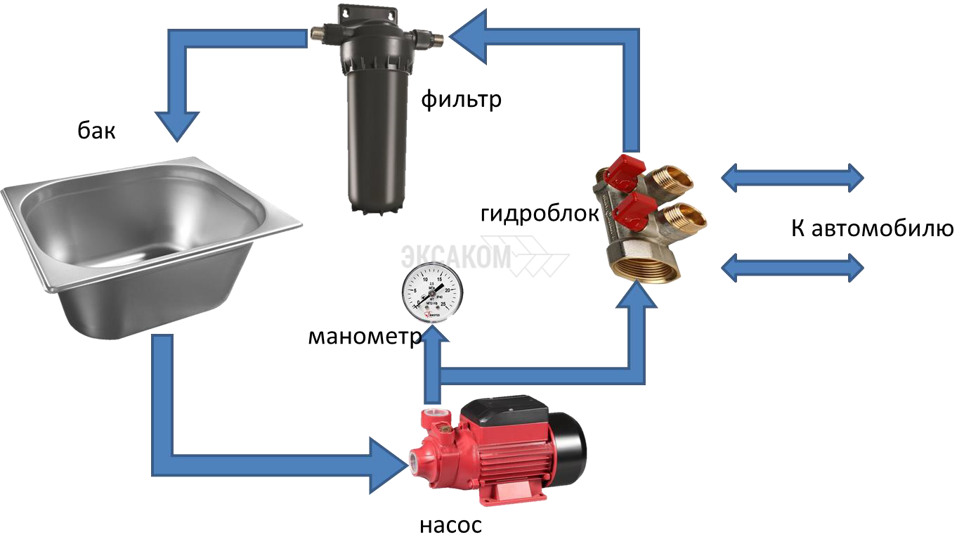 Установка РС1100 подключается к очищаемому компоненту системы охлаждения автомобиля с помощью двух шлангов. Подогретая до необходимой температуры моющая жидкость из бака при помощи насоса поступает в гидроблок. Давление контролируется с помощью манометра.