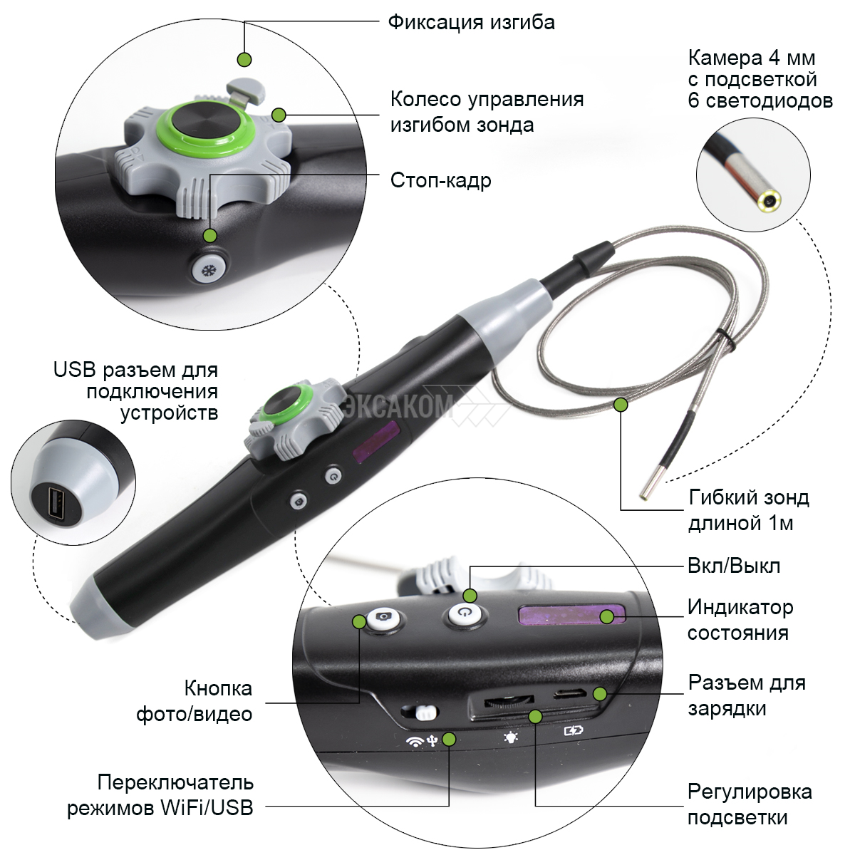 - Расположение поворотного колеса позволяет изменять положение камеры зонда одной рукой без лишних усилий